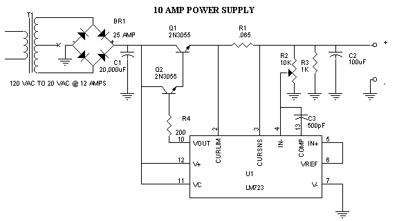 This Power Supply will deliver 8 amps continuous power and 10 amps surge. T-1 can be made from an old microwave transformer by removing the old secondary winding (high voltage winding) being careful not to damage the primary winding. After the Old secondary winding is removed wrap 20 turns of a pair of 16 ga. magnet wire make certain that each turn is lined up and that it is tight. This will help reduce humming noise from the transformer. Magnet wire is available at your local motor repair service relatively cheap!